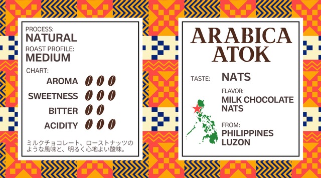 フィリピンの温暖でフルーツが栽培される地域ベンゲット州で栽培されたAtokは、柔らかで丸みのある味わいで、香ばしくミルクチョコレートやナッツの様なフレーバーのコーヒーです。 ミルクやオーツミルクとの相性もよく、オーレにして味わうのもオススメです。 品種:アラビカ種 酸味:3 苦味:2 甘さ:3 PROCESS NATURAL ROAST PROFILE MEDIUM BODY ROUND Atokのドリップパックを6つお送りします。 単体でご注文の場合レターパックにてご郵送します。 BOXが必要な方は購入時に備考欄に【ギフト用BOX】をご購入ください。※写真のBOXはイメージ図です。