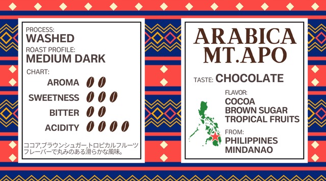 フィリピンのアポ山の中腹より上で栽培されたMount Apoは、朝晩の気温差により実の旨味が凝縮されたコーヒーです。ココア、ブラウンシュガー、トロピカルフルーツフレーバーでしっかりとした味わいで、ブラックやアイスコーヒーで飲んでも程よい酸味と優しい丸みが感じられます。 品種:アラビカ種 酸味:4 苦味:2 甘さ:3 PROCESS HONEY ROAST PROFILE MEDIUM BODY ROUND