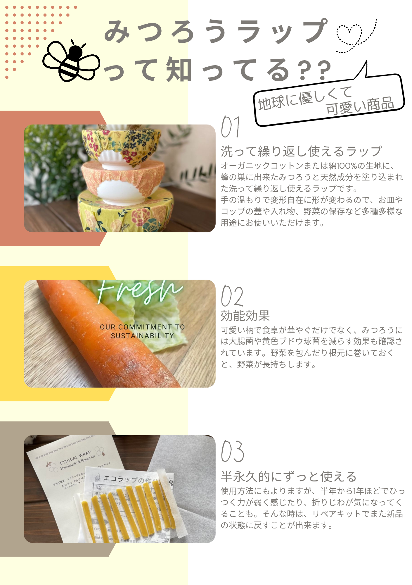 プラスチック製ラップとの違いは、「洗って繰り返し使える」「天然素材の通気性と保湿性、蜜蝋の高い抗菌性によって食品の鮮度を保ってくれる」「使用後は土に返って堆肥となる」というところ。一人ひとりの小さな取り組みが、未来への大きな優しい環境保護につながります。オシャレでありながら地球にやさしいミツロウラップで、脱プラ生活はじめてみませんか?