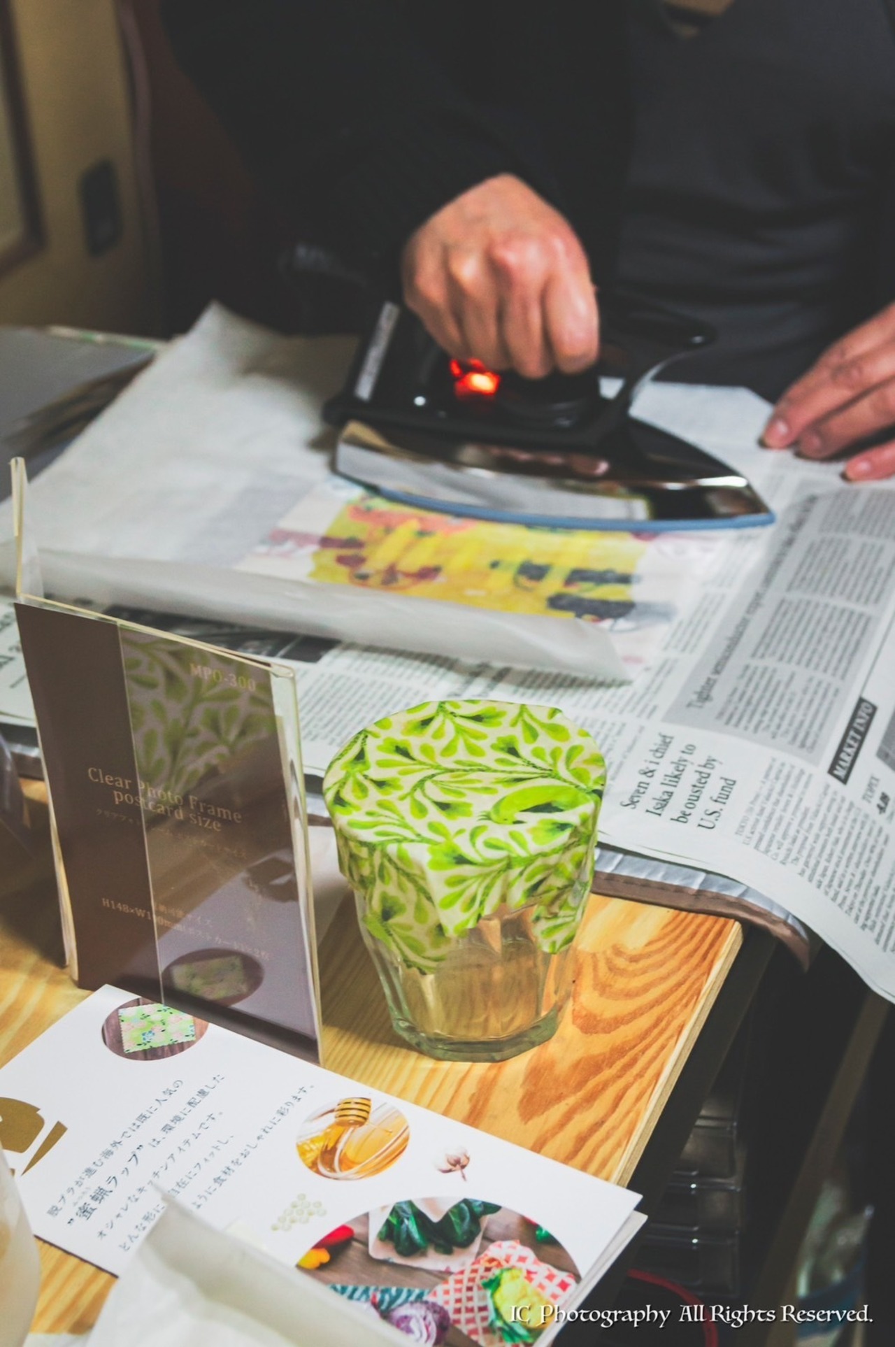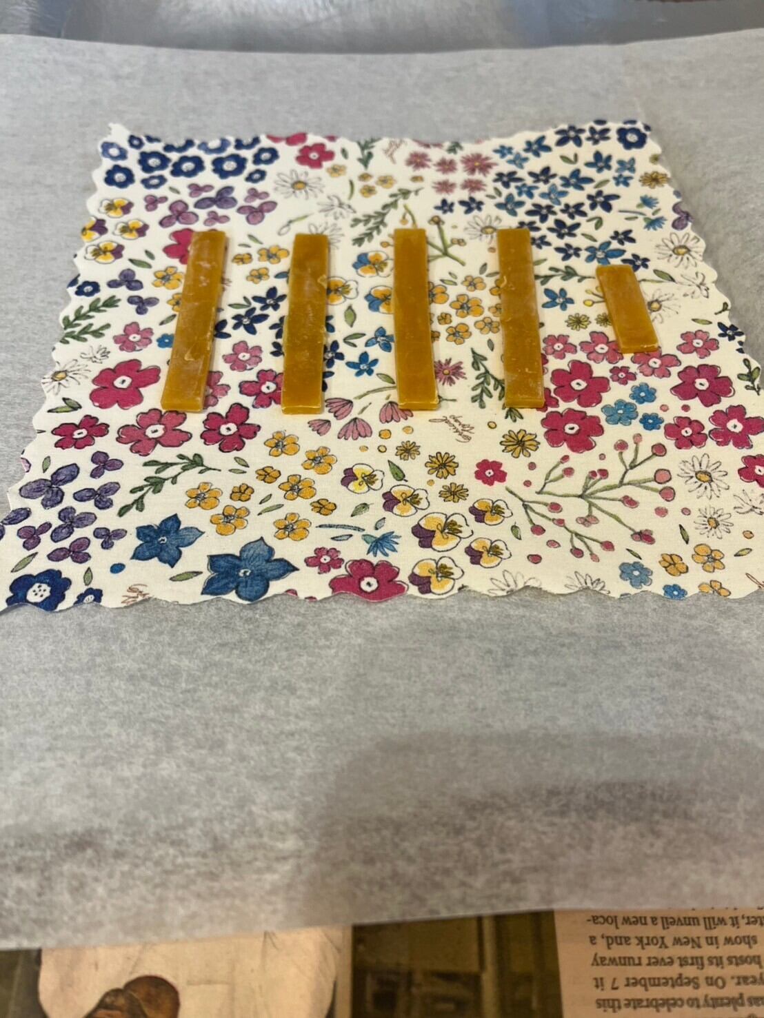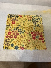 アイロン台に汚れないように新聞紙など、紙をひきます。クッキングシート→生地→ブレンド蜜蝋→クッキングシートの順に置き、上からアイロンで溶かし広げます。クッキングシートをはがしたら出来上がり♪