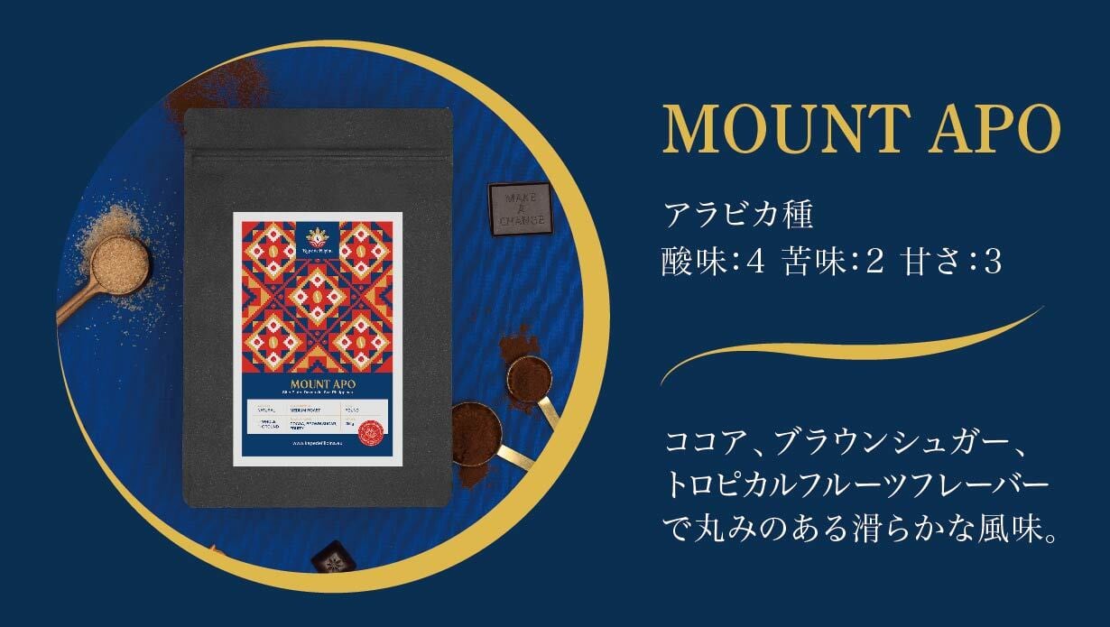 フィリピンのアポ山の中腹より上で栽培されたMount Apoは、朝晩の気温差により実の旨味が凝縮されたコーヒーです。ココア、ブラウンシュガー、トロピカルフルーツフレーバーでしっかりとした味わいで、ブラックやアイスコーヒーで飲んでも程よい酸味と優しい丸みが感じられます。