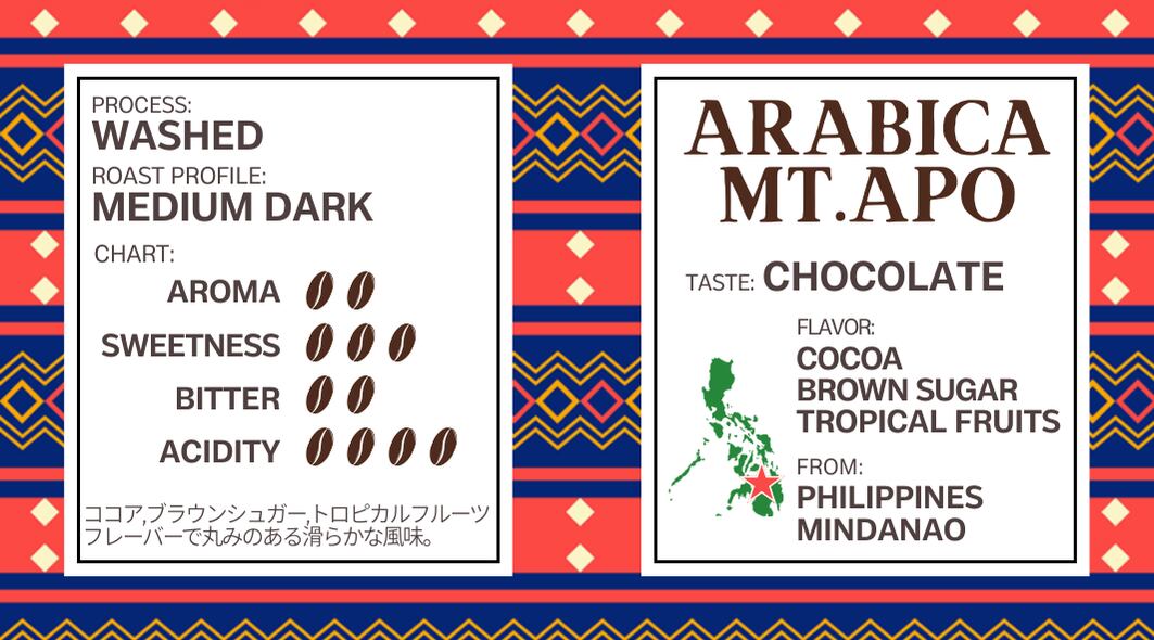 フィリピンのアポ山の中腹より上で栽培されたMount Apoは、朝晩の気温差により実の旨味が凝縮されたコーヒーです。ココア、ブラウンシュガー、トロピカルフルーツフレーバーでしっかりとした味わいで、ブラックやアイスコーヒーで飲んでも程よい酸味と優しい丸みが感じられます。