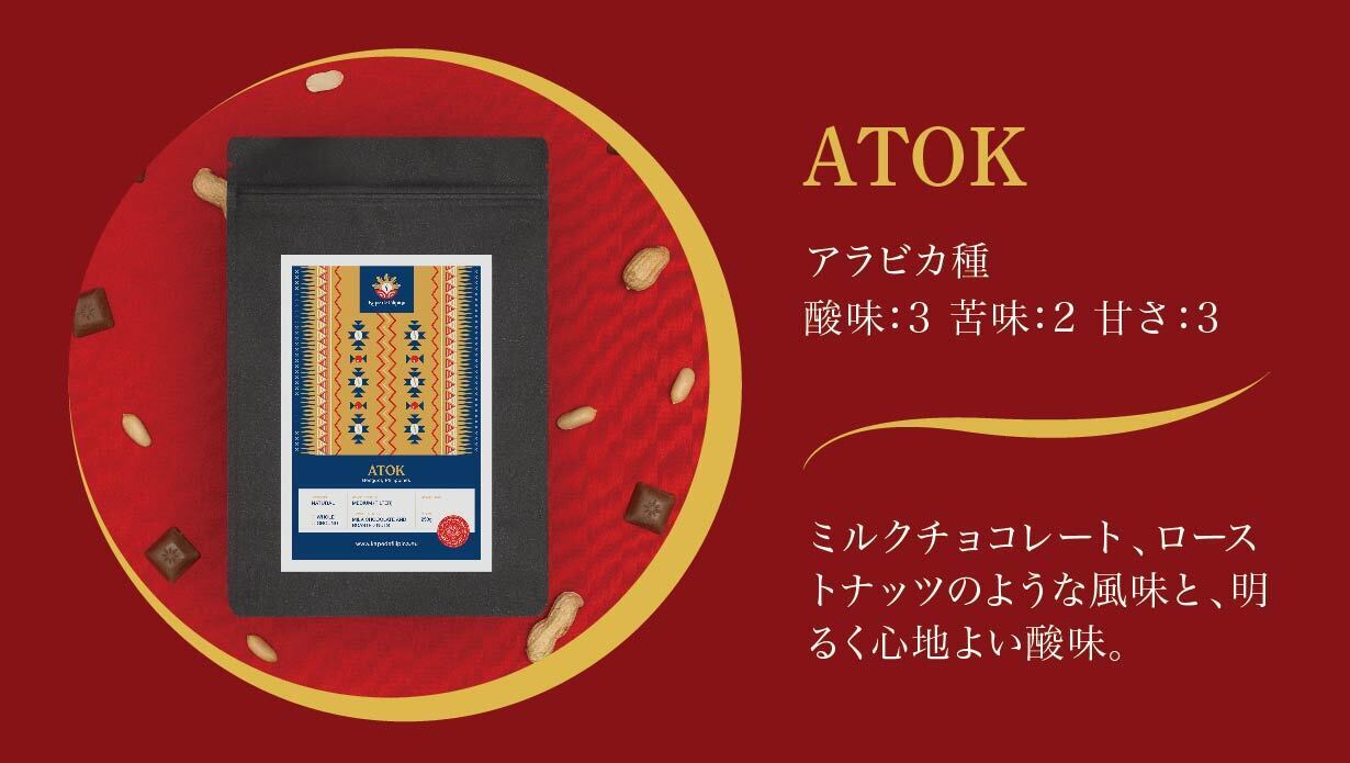 フィリピンの温暖でフルーツが栽培される地域ベンゲット州で栽培されたAtokは、柔らかで丸みのある味わいで、香ばしくミルクチョコレートやナッツの様なフレーバーのコーヒーです。